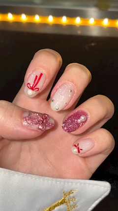 こんばんは!ONZEのももです🍑 5週間放置した左手のネイルをやっと塗り替えたよ💅🏻 絶妙に納得いってないけどまあ良しとします𓂃𓈒໒꒱𓏸 クリスマス意識でリボン🎀いっぱい! 親指は粘土ジェルを爪の上でコネコネ頑張りましたリボンの下も地味にチェック描いてるしラメでキラキラなのでとても可愛い⌯’▾‘⌯ 練習せずにぶっつけ本番で塗り替えするのそろそろやめたい♪笑 クリスマスよ、永遠になれ…🎄 今日も20じから🐰